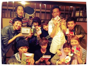 その後。。。 by Aqice co on 2012年12月26日 in えがたくの部屋 • 0 Comments 2012 AQICE 忘年会を行いました☆ みんな大好き 焼肉です☆ 何の顔かはわかりませんが何かしています 小山さんも!!! みんなでプレゼント交換しました!! 何がもらえたかな?? 最後にみんなで☆ ちなみに吉田君は酔っ払っています。。 たくさん食べて たくさん笑った そんな1日でした!! えがみ