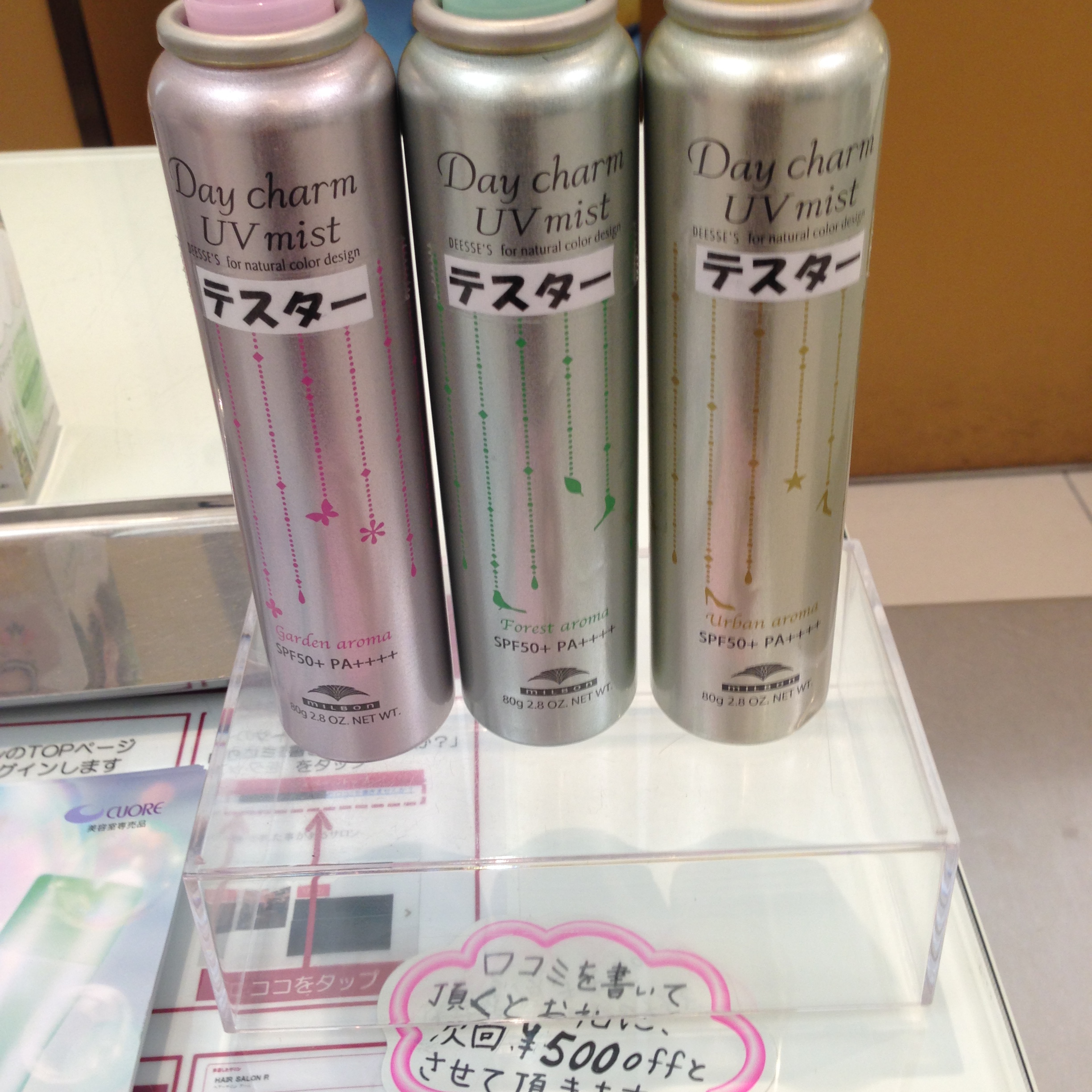 投稿日: 2015年5月20日2015年5月20日暑くなってきました こんにちは! 最近、昼間は暑い日が増えてきて 汗をかいてしまう日もありますね(;´Д`) ロベックでは今年もサマーシャンプーが入荷しました! とてもすっきりとした洗い上がりで気持ちいいです✨🍃 そしてもうひとつ、 UVミストスプレーも入荷しました UVをカットしてくれるだけでなく、 三種類のとってもいい香りのするスプレーです(∗•ω•∗) どちらもテスターがあるので、 ぜひお試しください。